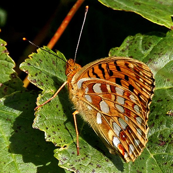 Viewed from below, there are extra orange-rimmed silver spots near the outer edges of the hindwings.