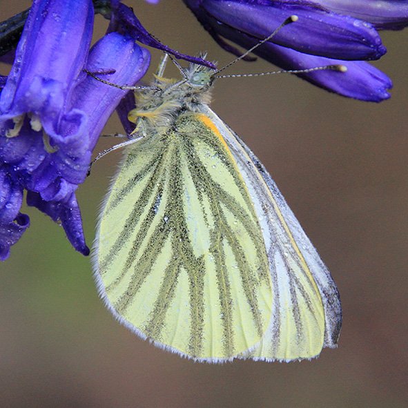 Green-veined White (male)Black tips to the forewings, extending along the edges to form a series of arrow-shaped dashes, with no black spots. The female has the same marking along the edges of its forewings as the male, with two black spots in the centre of the wing.