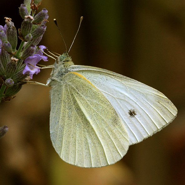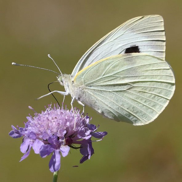 Large White (female)Extensive black markings on the tips of the forewings, similar to the male, but with two black spots in the centre of the forewing.