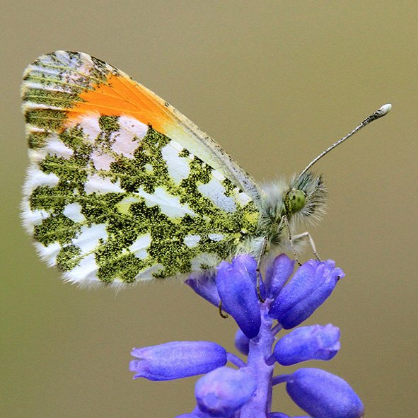 Orange-tip (female)The grey patches on the tips of the forewings are more extensive than in the Small White, with a rather chequered fringe, and there is one black spot in the centre of each forewing. Only the male has the distinctive orange splashes.
