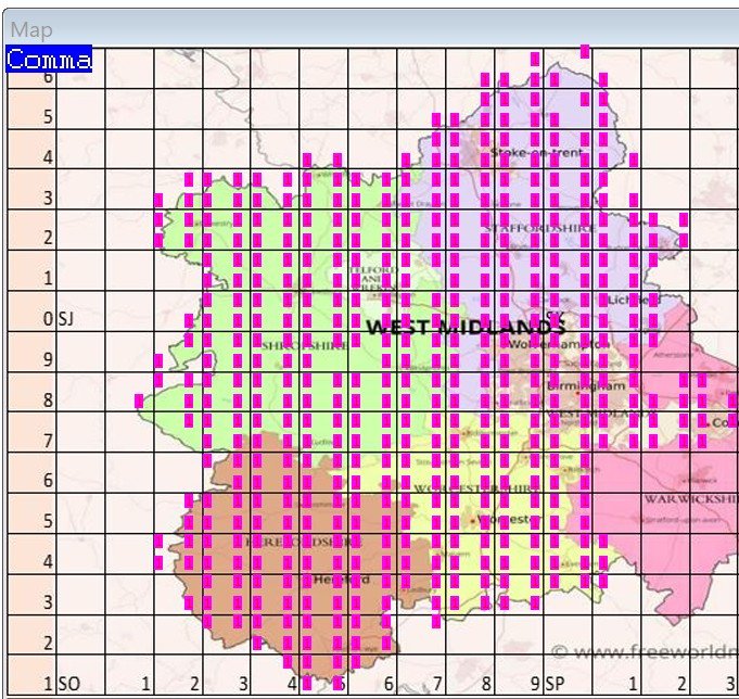 The highest transect counts are at Grafton Wood, the Knapp and Papermill Nature Reserve, Haugh Wood, Monkwood and the Rea Valley, Birmingham.