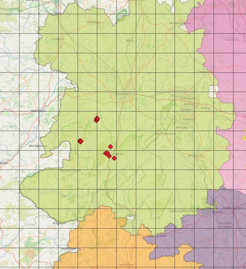 Oswestry Hills in Shropshire, Doward in Herefordshire, Swynnerton in Staffordshire, Throckmorton Landfill Site, Llanymynech Rocks, Ewyas Harold, Doward, Pound Green. Honeybourne - Disused Railway Line